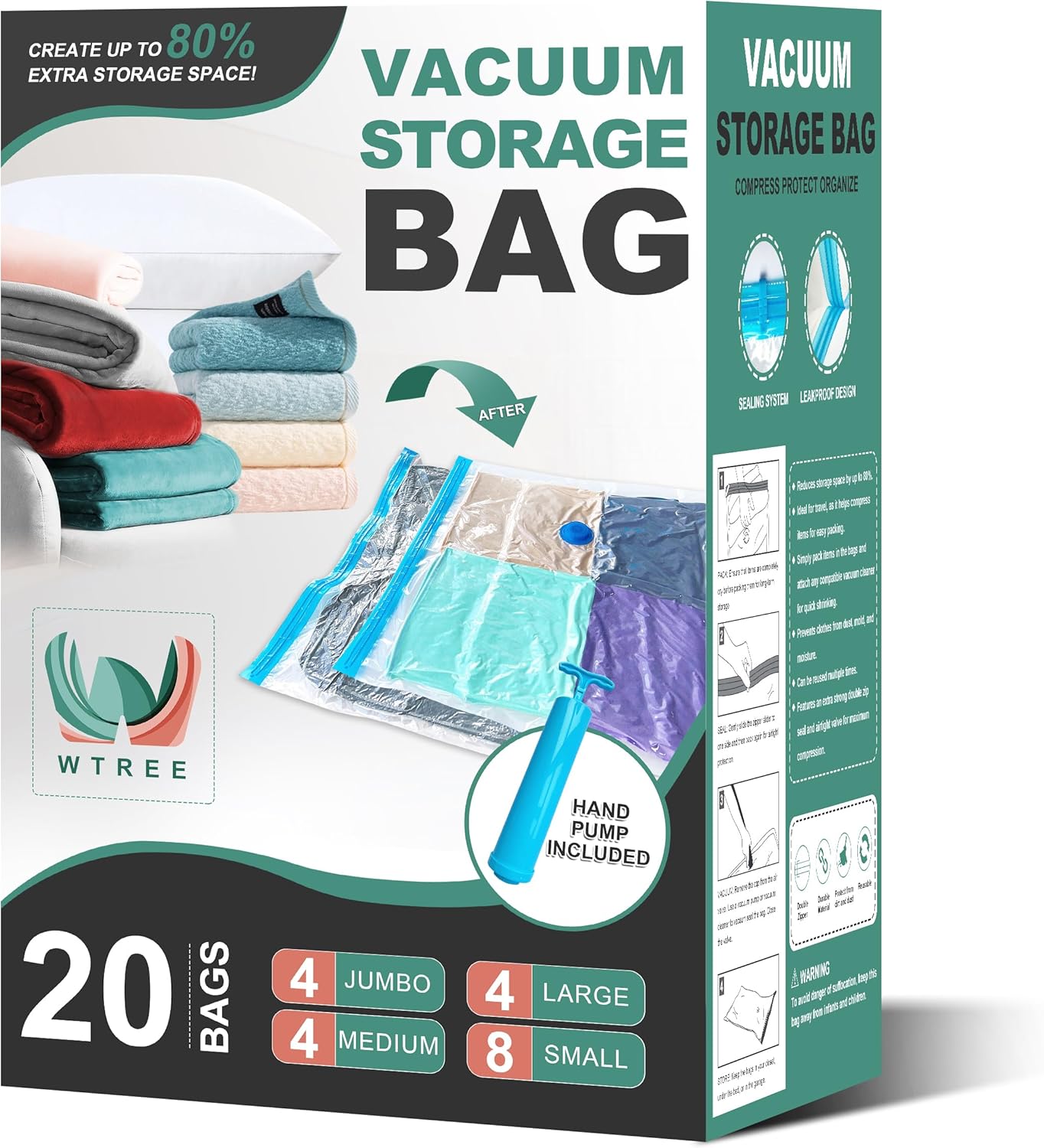 WTREE 20 Pack Vacuum Storage Bags, Space Saver Bags, Vacuum Sealed Bags for Comforters, Blankets, Clothes Storage, Hand Pump Included (4 Jumbo/4 Large/4 Medium/8 Small)